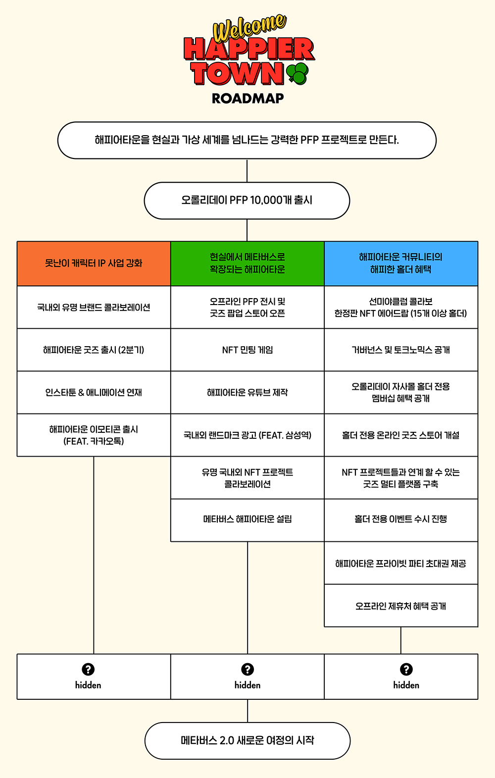 해피어타운을 운영하는 오롤리데이 2014년에 롤리와 조쓰가 설립해서 올해로는 26명의 팀원과 함께 9년차 브랜드가 되었다고 합니다. 오롤리데이는 당신의 삶을 더 행복하게 만듭니다 라는 미션을 목표로 문구 제조업으로 시작해서 각종 라이프스타일의 제품을 총 800여개의 종류나 제작 및 유통하고 있는 회사입니다. 제품제조를 넘어서 콘텐츠 제작도 하고 있으며 오프라인 shop으로의 확장 등 누군가의 행복을 위해 할 수 있는 도전을 끊임없이 진행하고 있습니다. 그리고 이제는 해피어타운 NFT프로젝트를 시작하며 가상 현실 세계에서의 행복의 형태를 찾아 나서려고 합니다. 현실과 가상 세계를 넘나드는 강력한 PFP 해피어타운 그것에 대해서 자세히 알아보도록 하겠습니다. 이어서 해피어타운 오롤리데이 NFT 민팅 정보도 아래에 적어보겠습니다.