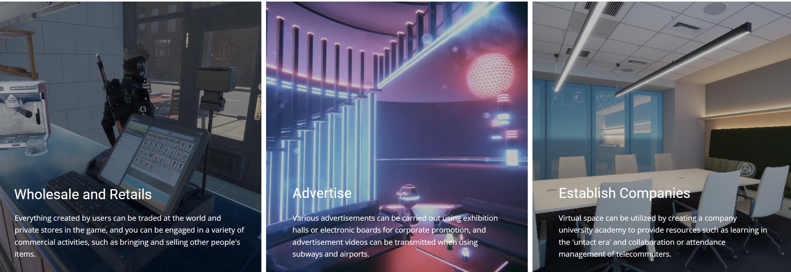 세컨드시티 에서는 옷이나 음식 주거 및 투자와 같은 실질적인 요소가 도입되며 비즈니스 상업 사회의 게임 등 실제요소가 가상세계에서 복합되어 나타나는 진정한 메타버스의 롤 모델이라고 볼 수 있습니다.