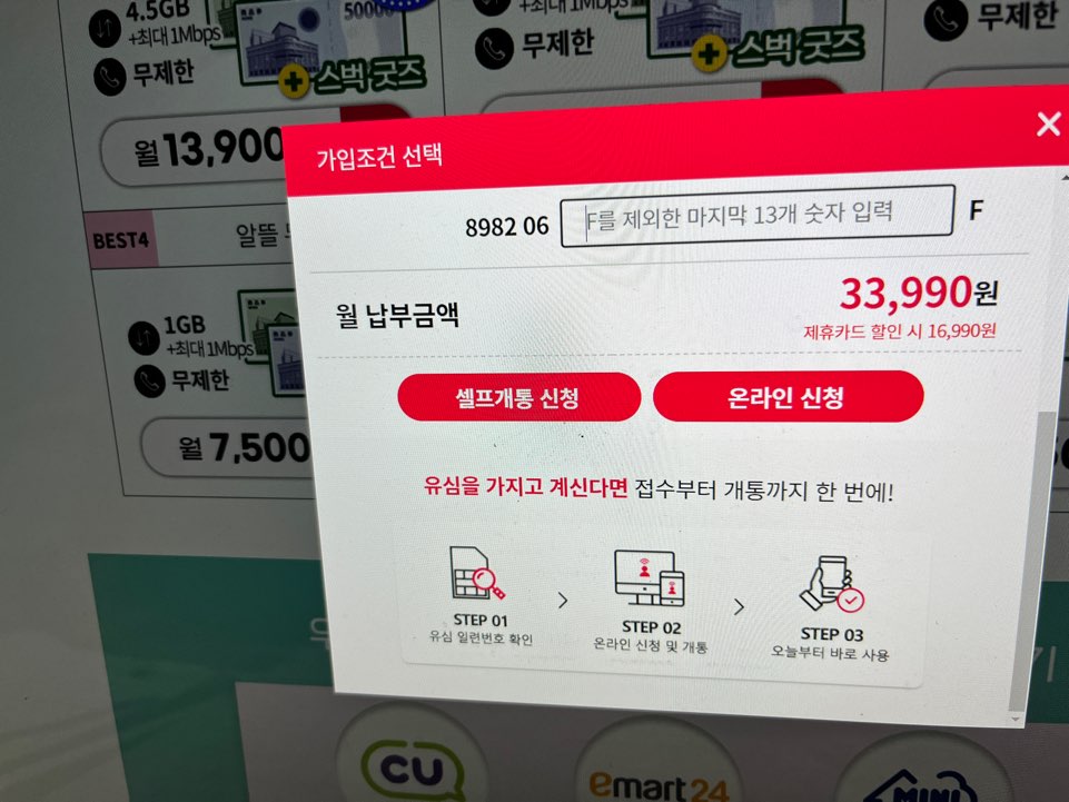 우리가 대표적으로 알고있는 이마트24 요금제의 경우 그 알뜰폰 통신사만 이용가능하다는 점이다. 그래서 이마트24 요금제를 알아보고 갔다고 한다면 해당 통신사의 유심을 구매해야한다.