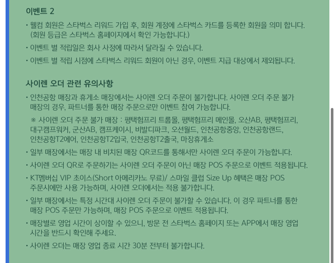 • 인천공항 매장과 휴게소 매장에서는 사이렌 오더 주문이 불가합니다. 사이렌 오더 주문 불가 매장의 경우, 파트너를 통한 매장 주문으로만 이벤트 참여 가능합니다.