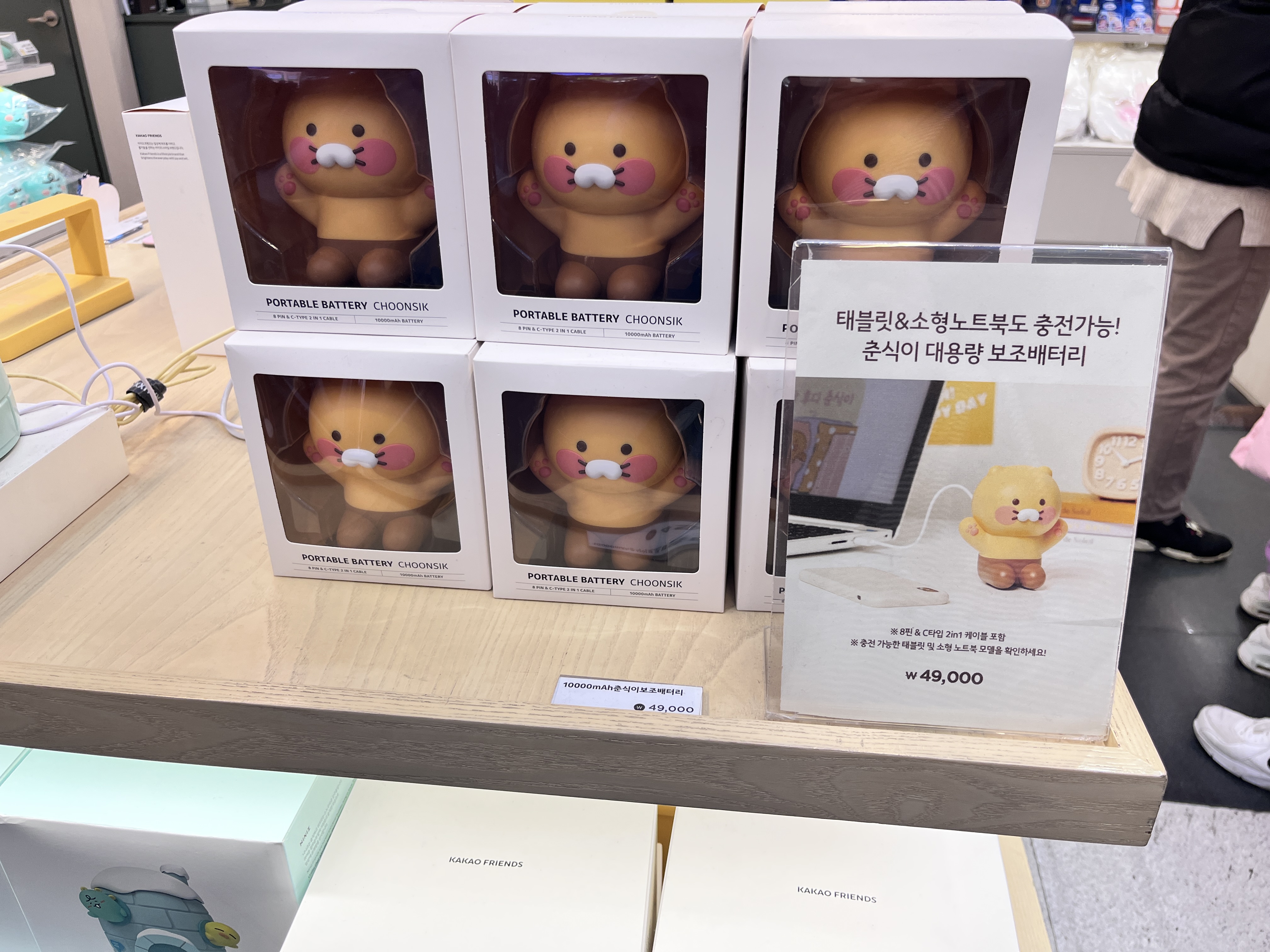 카카오프랜즈샵 피규어 큰걸 찾고 있다면 태블릿 소형 노트북도 충전가능한 춘식이 대용량 보조배터리를 참고하면 좋다. 49,000원에 가격은 조금 사악하지만 귀여움은 대용량 보조배터리중에는 우월한 춘식이 모양이다.